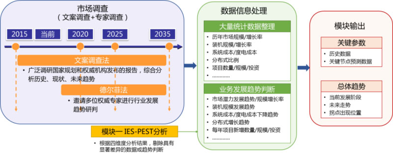 市場調查包括文案調查法和德爾菲法,重點調查國家規(guī)劃、權威報告、機構和知名專家觀點等,研判未來發(fā)展趨勢。梳理統(tǒng)計數(shù)據(jù)和預測數(shù)據(jù),根據(jù)模塊一進行數(shù)據(jù)篩選,剔除異常點,確定總體趨勢和關鍵參數(shù),作為模塊三的輸入。
