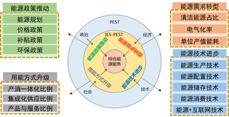 基于宏觀環(huán)境分析模型(PEST模型),構建綜合能源服務宏觀分析模型(IES-PEST模型),包括能源政策推動、能源需求轉型、用能方式升級和能源技術進步等四個分析維度。通過四維度分析,設置高、中、低三個情景方案。