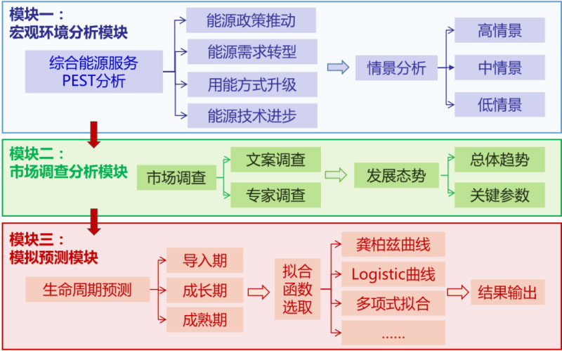基于生命周期理論,構建綜合能源服務市場測算模型。該模型由三大模塊組成:宏觀環(huán)境分析模塊明確影響業(yè)務發(fā)展的外部條件,設定情景方案;市場調查分析模塊調研行業(yè)現(xiàn)狀,研判發(fā)展態(tài)勢,確定關鍵參數(shù);模擬預測模塊擬合生命周期曲線,預測潛力規(guī)模。
