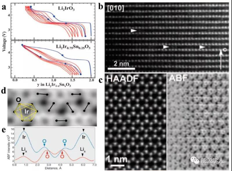 5d組過渡金屬氧化物基富鋰材料以Li2IrO3為主。由于Ir-o之間的鍵合共價性特征以及M(3d)-O(p)之間更大的帶寬,Li2IrO3的O得失電子的反應的可逆性會更強。近期McCalla 等人采用STEM以及中子衍射技術觀察到了類似超氧的結構(O-O)n-,進一步證明了O在Li脫嵌過程具有電化學活性的事實。與Li2RuO3類似,Li2IrO3也可以通過Sn摻雜改善結構穩(wěn)定性并提高循環(huán)容量保持率。