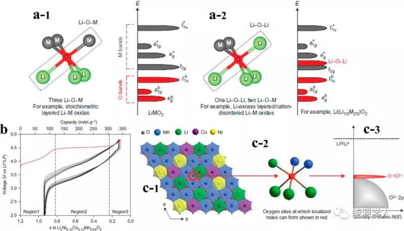 圖3:富鋰錳基材料Mn與O軌道雜化示意圖(a),(1-x) Li2MnO3–xLiMO2(M=Ni, Co, Fe, Cr, Mo, Nb, Ti, Al)的充放電曲線(b),過氧根形成的示意圖(c)