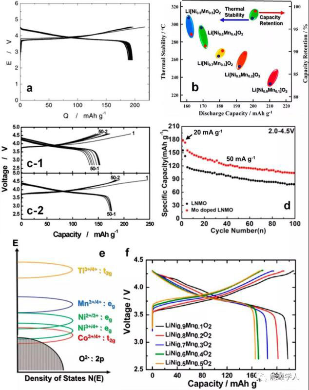 圖2:Li[Ni1/2Mn1/2]O2材料在2.5-4.5V區(qū)間的容量發(fā)揮以及循環(huán)性能(a),不同Ni含量Li[Ni1/2Mn1/2]O2體系安全性和能量密度關系(b),元素摻雜對容量發(fā)揮循環(huán)性能的影響(c、d),Ni、Co、Mn、Ti與O2-的2p軌道能態(tài)分布圖(e),不同Ni含量體系在4.3-2.7V區(qū)間的容量發(fā)揮對比(f)