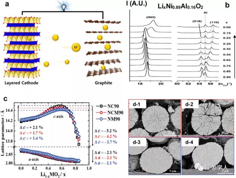 圖1:鋰離子電池工作示意圖(a),LixNi0.89Al0.16O2充電過程XRD變化過程(b),不同Ni、Co、Mn含量NCM充電過程C軸變化過程(c),不同共沉淀技術制備的NCM顆粒隨著循環(huán)進行,顆粒破碎情況
