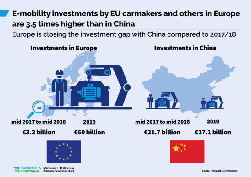 根據(jù)T&E的統(tǒng)計,截至2018年6月的12個月內,歐洲電動汽車市場僅獲得32億歐元(約合人民幣249億元)的投資,而同期中國電動汽車市場則吸引到217億歐元(約合人民幣1689億元)資金。