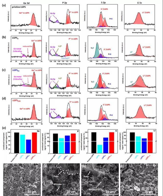圖4. a–d) 原始LGPS、LGPSLi、LGPSCC和LGPSCCG的Ge 3d, P 2p, S 2p和Li 1s XPS圖譜;e) Ge 3d, P 2p, S 2p和Li 1s XPS圖譜中各個樣品未被還原峰面積與總峰面積的比值;f–i) 原始LGPS、LGPSLi、LGPSCC和LGPSCCG的SEM圖。