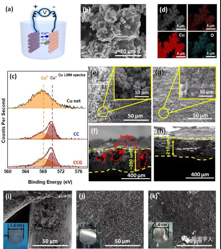 圖2. a) CCG/Cu電極的制備示意圖;b) CCG結(jié)構(gòu)的SEM圖;c) 不同結(jié)構(gòu)的Auger Cu LMM圖譜;d) CC結(jié)構(gòu)的EDS圖;e-h) CC/Cu和CCG/Cu電極沉積4 mAh cm-2鋰的正面和截面SEM圖;i-k) Cu net、CC/Cu和CCG/Cu電極熔鋰后的SEM和光學照片。
