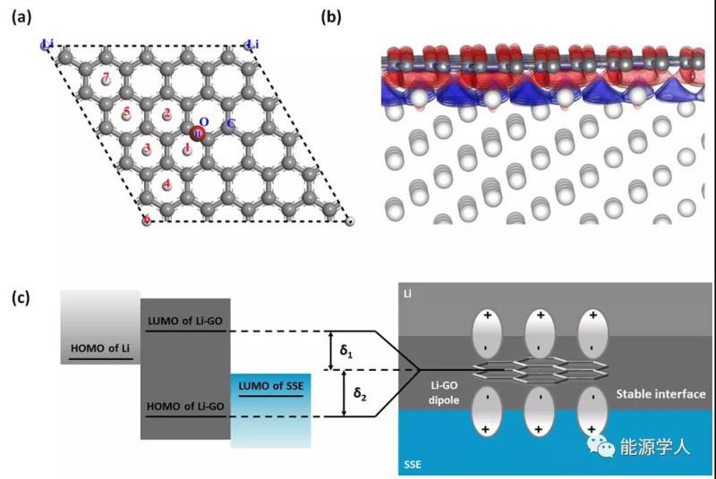 DFT模擬表明,鋰離子在沉積過程中,較為容易在石墨烯表面的環(huán)氧基團處發(fā)生吸附。發(fā)生吸附以后,進一步的電荷密度分析表明在Li-GO界面處,會發(fā)生明顯的趨向鋰附近的電子云偏移,進而形成具有偶極子效應的Li-GO結(jié)構(gòu)。由于鋰金屬的費米能級高于SSE,在直接接觸過程中,會發(fā)生由鋰向SSE的電子轉(zhuǎn)移,導致副反應發(fā)生。當鋰與SSE之間具有Li-GO結(jié)構(gòu)時,會形成界面能壘,阻礙電子從鋰向SSE發(fā)生遷移,進而提升鋰金屬/電解質(zhì)的界面穩(wěn)定性(圖1)。