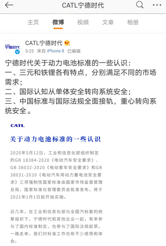 隨后,寧德時(shí)代在官方微博發(fā)布了《關(guān)于動(dòng)力電池標(biāo)準(zhǔn)的一些認(rèn)識(shí)》,內(nèi)容包括三元和鐵鋰電池分別滿足不同市場(chǎng)的需求;目前國(guó)際認(rèn)知從電池單體安全轉(zhuǎn)向電池系統(tǒng)安全;中國(guó)標(biāo)準(zhǔn)的重心在轉(zhuǎn)向電池系統(tǒng)安全等三點(diǎn)內(nèi)容。