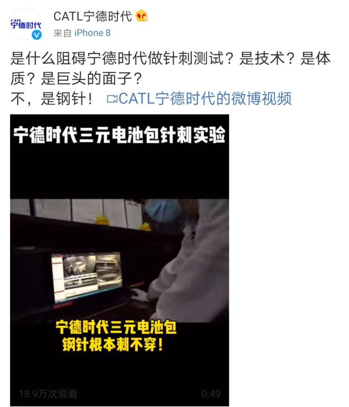 這兩句看似稀松平常的話被吃瓜群眾看作是對(duì)比亞迪的“隔空互懟”。三元鋰電池的安全問(wèn)題,本身就比較敏感。在雙方一來(lái)一回的“互懟”后,寧德時(shí)代為了自證三元鋰電池安全——證明三元鋰電池能夠通過(guò)針刺試驗(yàn),也發(fā)布視頻作為回應(yīng)。
