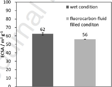 下圖顯示了MEA(1)的電化學(xué)活性面積(ESCA),該值是濕操作和碳氟化合物流體填充條件下在電位掃描過程用CO消除電荷估算得出的。濕操作下ECSA大于碳氟化合物流體填充條件下的ECSA。如前所述,碳氟化合物流體填充條件下ECSA與濕操作下的ECSA之比即是陰極聚合物覆蓋率。MEA(1)兩個樣品的聚合物覆蓋率分別為88%和92%。上述結(jié)果表明,負(fù)載在非多孔碳上的Pt納米顆粒大部分被聚合物所覆蓋。
