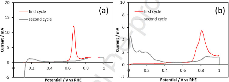 下圖分別顯示了膜電極MEA(2)和MEA(3)在濕操作和碳氟化合物流體填充下的CO消除伏安圖,兩者陰極帶有不同類型的多孔碳載體。類似非多孔碳載體,在高電位下,陰極碳氟化合物流體填充下觀察到的CO氧化電流比在濕操作條件下更高。