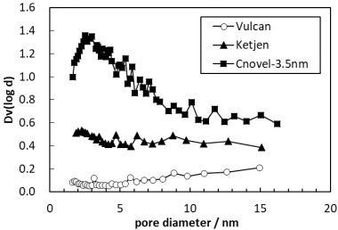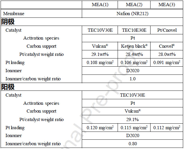 本次研究總共制備三種碳載體型膜電極,一種為非多孔碳載體,另外兩種為多孔碳載體。針對每種碳載體型膜電極,分別制備2片膜電極。下表為此次研究中膜電極的具體信息。作為商用非多孔碳載體和多孔碳載體催化劑,TEC10V30E (Pt/Vulcan)和TEC10E30E (Pt/Ketjen)都采購自田中貴金屬。此外,另一種Cnovel多孔碳載體催化劑為自制,其中Cnovel碳載體采購自東陽炭素。為降低進入內(nèi)部孔隙的阻力,將Cnonel碳載體在500℃空氣中進行預(yù)處理以氧化去除少量碳碎片。Vulcan、Ketjen和Cnovel三種碳載體的孔徑分布如下圖所示。