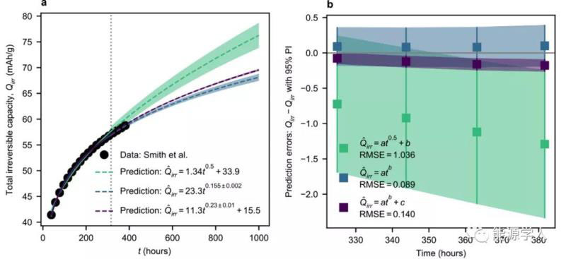 SEI生長模型的一個(gè)常見用途是預(yù)測電池壽命,這本質(zhì)上是一個(gè)時(shí)間序列預(yù)測問題。對于這個(gè)用途,函數(shù)形式的選擇對于準(zhǔn)確的預(yù)測是至關(guān)重要的。評價(jià)候選模型預(yù)測能力的一種簡單方法是將初始數(shù)據(jù)擬合,并將最后的幾個(gè)點(diǎn)作為一個(gè)測試集,然后比較各個(gè)模型之間測試集的均方根誤差(RMSE)。如圖4,Smith等人已經(jīng)將這種方法應(yīng)用于壽命預(yù)測。選擇該系列進(jìn)行分析,以說明在不與多個(gè)模型進(jìn)行比較的情況下使用t0.5進(jìn)行預(yù)測的不可靠性。圖4a中展示了更長時(shí)間的外推趨勢線,顯示了t0.5如何高估了冪律模型所估計(jì)的衰減。t0.5模型在1000 h時(shí)的額外預(yù)測總不可逆容量(Qirr)比兩項(xiàng)冪律模型大66%。這些經(jīng)典的預(yù)測區(qū)間只考慮隨機(jī)誤差項(xiàng)的不確定性,而不考慮參數(shù)估計(jì),因此可能低估了誤差。為了從經(jīng)驗(yàn)上確定數(shù)據(jù)集的合適函數(shù)形式,再次建議使用殘差分析。殘差沒有系統(tǒng)趨勢的擬合具有較低的偏差,這對于長時(shí)間的準(zhǔn)確預(yù)測尤為重要。進(jìn)一步研究了適用于Smith等人工作的所有被考慮的函數(shù)形式,但其殘差中都表現(xiàn)出一種系統(tǒng)的趨勢;而且t0.5模型是本系列中性能最差的候選函數(shù)形式。在循環(huán)過程中的SEI生長預(yù)計(jì)不會遵循t0.5模型,因此在殘差沒有系統(tǒng)趨勢的情況下確定一個(gè)合適的模型可能具有挑戰(zhàn)性。