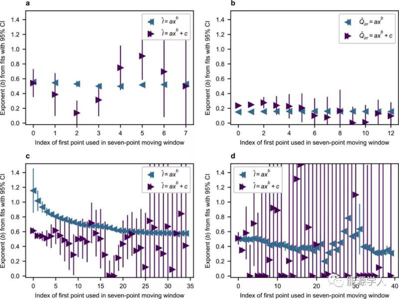 從理論上講,SEI可能會隨著薄膜的生長而在時(shí)間尺度上發(fā)生轉(zhuǎn)變,這些類型的轉(zhuǎn)變在氧化文獻(xiàn)中很常見。事實(shí)上,即使是最簡單的表面膜生長模型(如Deal-Grove),最初的反應(yīng)也局限于較低的膜厚度(一階反應(yīng)具有線性時(shí)間依賴性)。對第一周期SEI生長的實(shí)驗(yàn)測量表明,過電位是速率的指數(shù)函數(shù),這表明了Butler-Volmer動力學(xué)和表面反應(yīng)動力學(xué)對SEI的初始限制。如圖11,將7個(gè)相鄰點(diǎn)同時(shí)擬合到兩個(gè)冪律表達(dá)式中,以檢驗(yàn)擬合指數(shù)與四個(gè)系列中循環(huán)數(shù)的函數(shù)的相關(guān)性。在除一個(gè)系列之外的所有系列中,使用任何一個(gè)模型,指數(shù)都保持相當(dāng)恒定。這一結(jié)果表明,至少在這四個(gè)數(shù)據(jù)系列中,SEI的時(shí)間依賴性在第一個(gè)循環(huán)之后不會發(fā)生重大轉(zhuǎn)變。