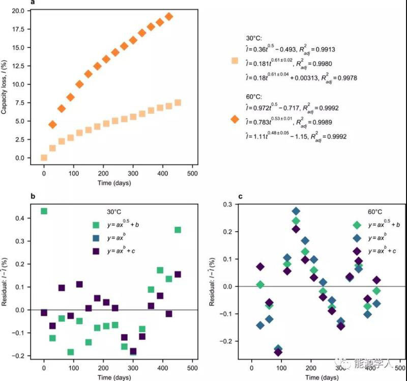 在以往的SEI工作中,一種常見的做法是將數(shù)據(jù)擬合到t0.5模型,目前最簡單但最有效的方法之一是殘差的圖形分析,這種方法雖然是定性的,但它提供了對模型性能的直觀理解。根據(jù)以往SEI文獻(xiàn)中的六個(gè)選定數(shù)據(jù)集和一個(gè)新數(shù)據(jù)集,重新評估了SEI生長的時(shí)間依賴性,及其所聲稱的t0.5依賴性。首先對Broussely等人的數(shù)據(jù)擬合如圖2所示,發(fā)現(xiàn)所有模型的Radj2值都是可比較的,并且兩個(gè)數(shù)據(jù)集所有擬合的殘差看起來都是隨機(jī)的。冪律擬合的指數(shù)非常接近0.5(最大偏差=0.11),然而,只有一個(gè)0.5的擬合指數(shù)(三項(xiàng)冪律,60 °C)在95%的置信區(qū)間。在這種情況下,t0.5模型實(shí)際上產(chǎn)生了與廣義冪律模型類似的結(jié)果;但是,嚴(yán)格地說,0.5的指數(shù)只能在四種情況中的一種情況下使用。對其他數(shù)據(jù)的擬合結(jié)果也都表明,t0.5模型的性能與廣義冪律模型基本相當(dāng),甚至有些情況下廣義冪律模型提供的性能要比t0.5模型稍好一些。在回顧的17個(gè)系列中只有1個(gè)(28個(gè)冪律擬合中的1個(gè))0.5的擬合指數(shù)能夠落在95%的置信區(qū)間。這一系列結(jié)果表明,t0.5模型在描述SEI生長方面的統(tǒng)計(jì)依據(jù)是薄弱的。此外,很少有因素與t0.5模型的高性能密切相關(guān),這表明了分別評估每個(gè)數(shù)據(jù)集擬合優(yōu)度的重要性。
