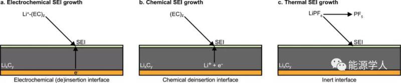 通常,t0.5依賴關(guān)系是擴(kuò)散受限過程的特征,對于SEI生長,通??紤]兩個(gè)主要的限速傳輸物質(zhì):電子在電解液/SEI界面(“外部”SEI生長)或溶劑/鹽陰離子在SEI/電極界面(“內(nèi)部”SEI生長)反應(yīng)。如果限速物質(zhì)帶電(如電子),除了擴(kuò)散外,還必須考慮更復(fù)雜的輸運(yùn)方式,如遷移。因此,SEI的生長不太可能僅僅受到擴(kuò)散的限制,尤其是在不同的時(shí)間和長度尺度上。根據(jù)鋰離子和電子的來源和吸收,SEI的生長可以分為三種生長模式:電化學(xué)、化學(xué)和熱學(xué)(圖1)。