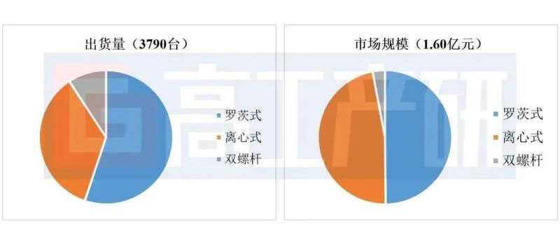 GGII調(diào)研數(shù)據(jù)顯示,離心式空壓機和羅茨式空壓機在市場份額上呈膠著狀態(tài),螺桿式空壓機所占市場份額也不少。