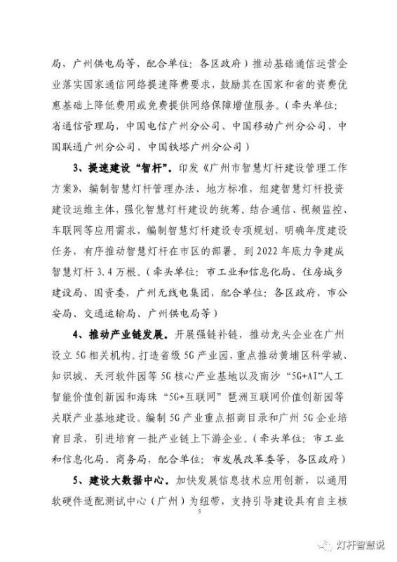 值得注意的是,文件明確要提速建設(shè)“智桿”,該任務(wù)的牽頭單位為廣州市工業(yè)和信息化局、住房城鄉(xiāng)建設(shè)局、國(guó)資委,廣州無(wú)線電集團(tuán),相關(guān)配合單位為各區(qū)政府,市公安局、交通運(yùn)輸局、廣州供電局等。