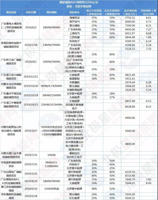 2019年儲能調(diào)頻是最熱門的應(yīng)用領(lǐng)域,上半年曾密集發(fā)布了多個項目招標(biāo);2020年近半年來僅有4個儲能調(diào)頻項目發(fā)布了招標(biāo)、中標(biāo)消息。據(jù)北極星儲能網(wǎng)不完全統(tǒng)計,2019年以來儲能調(diào)頻報價并沒有太大降幅,投標(biāo)單價基本維持在6~8元/Wh。2019年曾有一家企業(yè)在內(nèi)蒙古烏拉特儲能調(diào)頻項目中以5.54元/Wh打破行業(yè)最低報價記錄,不過直到目前2020年最低單價報價記錄為珠海鈺海熱電聯(lián)產(chǎn)儲能調(diào)頻項目中科陸電子的6.14元/Wh。此次開標(biāo)的大埔發(fā)電儲能調(diào)頻項目中,海博思創(chuàng)和智光電氣的投標(biāo)單價超過了8元/Wh。詳細如下: