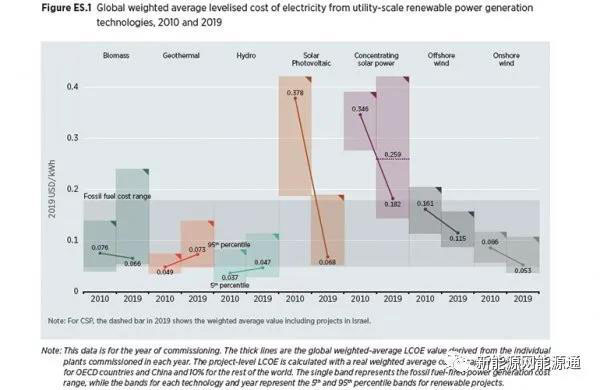 自2010年以來,公用事業(yè)規(guī)模的太陽能光伏發(fā)電的成本下降幅度最大,為82%,其次是聚光太陽能發(fā)電(CSP),為47%,陸上風(fēng)能為39%,海上風(fēng)能為29%。