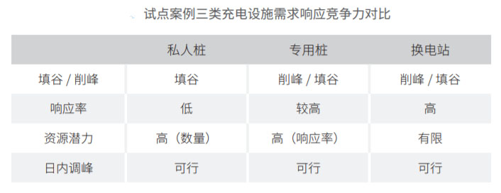 報告結(jié)合試點效果與經(jīng)濟性分析,對三類充換電設(shè)施未來參與電力需求響應(yīng)的前景進行了對比。電動汽車接入私樁的時段往往在傍晚至凌晨,更適合參與負荷填谷。相比之下,專用樁和換電站的調(diào)節(jié)靈活度較高。從試點結(jié)果看,專用樁和換電站可實現(xiàn)相對集中管理,對調(diào)度指令的響應(yīng)率也較高。需求響應(yīng)資源量方面,私樁和專用樁的規(guī)模潛力較大,應(yīng)合理設(shè)計激勵機制,加大對私樁和專用樁的資源潛力挖掘力度。雖然目前換電站調(diào)節(jié)能力較強,但隨著車輛日常換電需求的增大,其日間參與需求響應(yīng)的效果將取決于換電站備用電池數(shù)量和綜合管控能力。