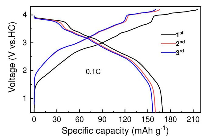 圖4. O3-NNFM正極和硬碳負極全電池在0.5-4.2 V電壓范圍內(nèi)的前三周充放電曲線