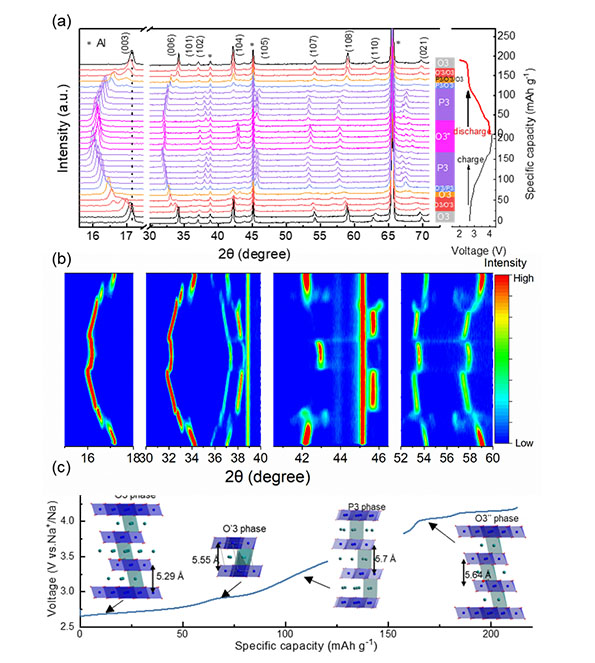 圖3. O3-NNFM材料(a,b)首圈充放電過程中的原位XRD圖譜和2D contour圖,(c)充電過程中的結(jié)構(gòu)演化示意圖