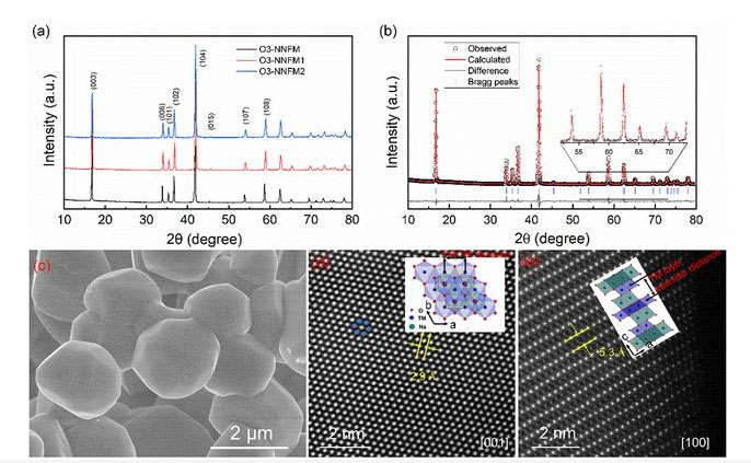 圖1.(a)系列O3-Na[NixFeyMn1-x-y]O2 (x=0.6、0.7和0.8分別對應O3-NNFM、O3-NNFM1和O3-NNFM2)樣品的XRD圖譜,(b-e)O3-Na[Ni0.60Fe0.25Mn0.15]O2的XRD圖譜精修、SEM和STEM表征