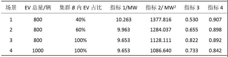 文章研究了不同場景下的電動汽車有序充電引導控制效果,如表1所示,其中指標1-4分別代表負荷峰谷差、負荷離差平方和、平均費用滿意度和平均出行滿意度。