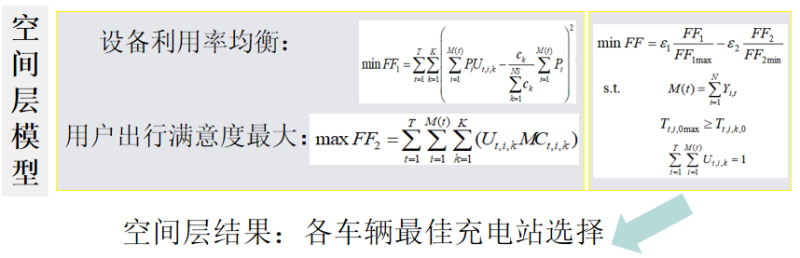 以時間層得到在各時間段開始充電的電動汽車數(shù)量作為約束條件,建立空間層實時優(yōu)化模型,進行充電站選擇。在充電站角度,希望按充電站充電設備的規(guī)模來均勻分配車輛;在用戶角度,以用戶出行滿意度最大為目標函數(shù)。因此建立的空間層優(yōu)化模型如圖6所示。