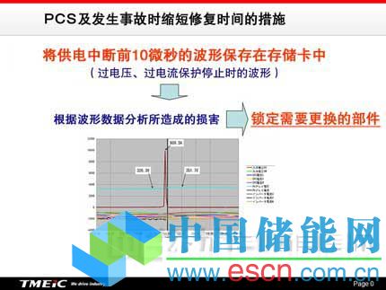 PCS配備了過電壓、過電流保護(hù)裝置,會斷開直流電路來防止雷擊導(dǎo)致事故擴(kuò)大,但重要的是,發(fā)生故障后如何盡快修復(fù),從而使發(fā)電損失降至最低。TMEIC通過將保護(hù)裝置啟動10μs之前的電壓及電流波形保存在存儲卡內(nèi),來掌握入侵的浪涌能量,并在短時(shí)間內(nèi)鎖定發(fā)生故障的部件,由此縮短了修復(fù)時(shí)間(圖)。