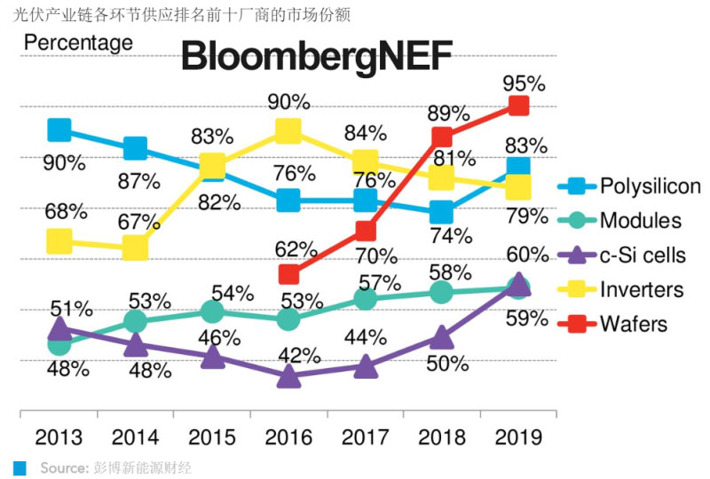 多晶硅和硅片環(huán)節(jié)持續(xù)整合。中國多晶硅廠商贏得更多市場份額,在全球產(chǎn)量占比從2018年的58%增至2019年66%。在硅片環(huán)節(jié),2019年前十家硅片廠商供應了95%的全球市場。