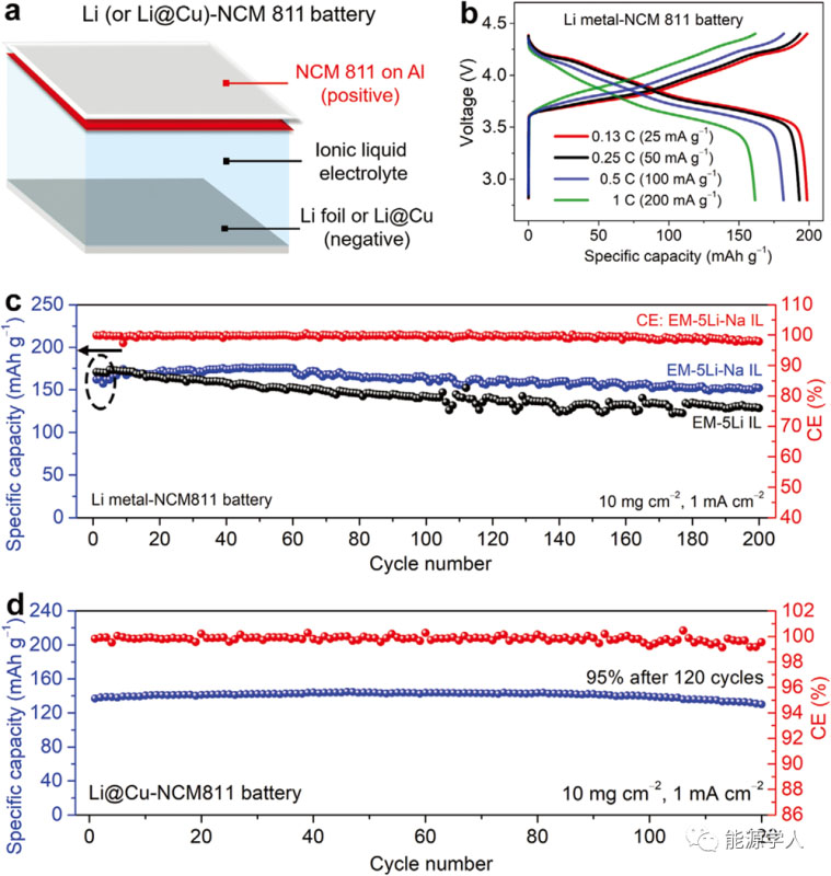 圖5 采用EM-5Li-Na-IL電解液的NCM811基鋰金屬電池。a) NCM811基鋰金屬電池結(jié)構(gòu)示意圖,負(fù)極為L(zhǎng)i金屬或Li@Cu。b) NCM811基鋰金屬電池不同倍率下(0.25-1 C,25-200 mA g-1)的恒流充放電曲線。c) 分別使用EM-5Li和EM-5Li-NaIL電解液的Li-NCM811電池在0.5 C下的循環(huán)穩(wěn)定性。(b-c)中的比容量均基于NCM811的質(zhì)量。d) 使用EM-5Li-Na IL電解液的Li@Cu-NCM811電池在0.5 C下的的循環(huán)穩(wěn)定性。所沉積Li金屬的容量約1.8倍過(guò)量。(d)中比容量基于正、負(fù)極總質(zhì)量。(a-d)中NCM811的載量為≈10 mgcm?2。
