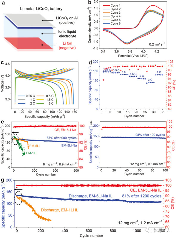 圖3 采用EM-5Li-Na - IL電解液的Li-LiCoO2電池的電化學(xué)性能。a) Li-LiCoO2電池結(jié)構(gòu)示意圖。b)采用 EM-5Li-Na IL電解液的Li-LiCoO2電池的CV曲線,掃描速率為2mv s?1。c) 使用EM-5Li-Na IL電解液的Li-LiCoO2電池在不同倍率下(0.25-3 C)的恒流充放電曲線。d) 使用EM-5Li-Na IL電解液的Li-LiCoO2電池的倍率性能。(b-d)中LiCoO2的載量為≈6 mg cm?2。e) 使用EM-1Li、EM-5Li和EM-5Li-Na IL電解液的Li-LiCoO2電池在1 C下的循環(huán)穩(wěn)定性曲線,LiCoO2的載量為≈6 mg cm?2。f)使用EM-5Li-Na IL電解液的Li - LiCoO2電池在0.35 C下的循環(huán)性能曲線,LiCoO2的載量為≈12 mg cm?2。g)分別采用EM-1Li和EM-5Li-NaIL電解液時(shí)Li-LiCoO2電池的循環(huán)性能曲線,LiCoO2的載量為≈12 mg cm?2,所有電池先在0.25 C下循環(huán)2次,隨后在0.7 C(≈1.2 mA cm?2) 下進(jìn)行循環(huán)性能比較。