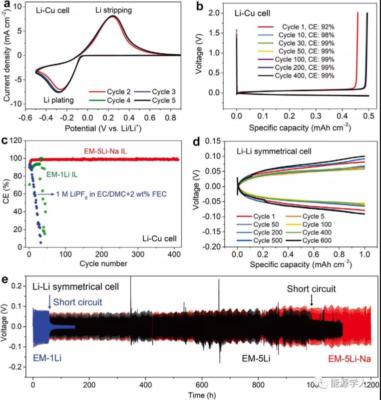 圖2 不同離子液體電解液的電化學(xué)性能。a)采用 EM-5Li-Na IL電解液的Li-Cu電池的CV曲線,掃描速率為2mvs?1。b) 使用EM-5Li-NaIL電解液的Li-Cu電池進(jìn)行Li沉積/溶解時(shí)的充放電曲線。c)分別采用傳統(tǒng)有機(jī)電解液、EM-1Li和EM-5Li-Na IL電解液時(shí)Li-Cu電池中Li沉積/溶解的庫(kù)侖效率。(b,c)中電流密度和面積比容量分別為0.5 mA cm?2和0.5 mAh cm?2。d)使用EM-5Li-Na IL電解液的Li/Li對(duì)稱電池在不同循環(huán)次數(shù)下的Li沉積/溶解曲線。e)分別采用EM-1Li、EM-5Li和EM-5Li-Na IL電解液時(shí)Li /Li對(duì)稱電池的Li沉積/溶解曲線。(e,f)中電流密度和面積比容量分別為1 mA cm?2和1 mAh cm?2。
