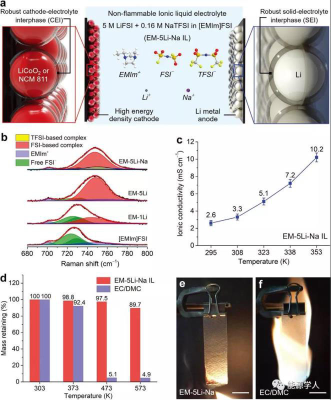 圖1 不易燃離子液體電解液的特性。a) EM-5Li-Na IL電解液的組成與電池結(jié)構(gòu)示意圖。b)純[EMIm]FSI、EM-1Li、EM-5Li和EM-5Li-Na ILs的拉曼光譜。c) EM-5Li-Na IL在不同溫度下的離子電導(dǎo)率。d) EM-5Li-Na IL電解液與常規(guī)有機(jī)電解液(1 M LiPF6-EC/DMC, 1:1 vol)的熱穩(wěn)定性分析。e,f) EM-5Li-Na IL電解液(e)傳統(tǒng)1 M LiPF6-EC/DMC有機(jī)電解液(f)的易燃性測(cè)試