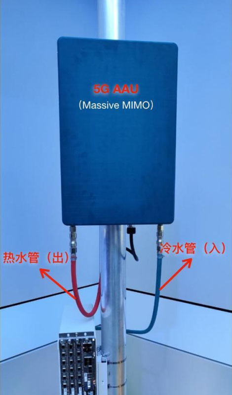 從上圖看,5G AAU配置了冷水管(入)和熱水管(出),通過液冷自循環(huán)降溫。