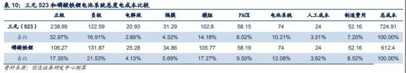 僅考慮電芯的情況下,三元 523 和磷酸鐵鋰電芯的度電成本分別為 486.96 和 374.44 元/kWh。