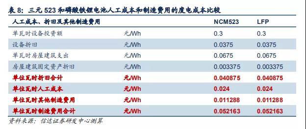 動(dòng)力電池生產(chǎn)成本包括人工成本和制造費(fèi)用,制造費(fèi)用其中有包括設(shè)備和房屋建筑折舊及其他制造費(fèi)用。我們假設(shè) 1GWh 產(chǎn) 能設(shè)備投資價(jià)值 3 億元,人工 400 人,每年工作 300 天,每天工作 8 小時(shí),人工小時(shí)數(shù)為 960000 小時(shí)/年,工時(shí)費(fèi) 25 元/時(shí), 對(duì)應(yīng) 2400 萬(wàn)元/年,得出人工成本 24 元/KWh;設(shè)備折舊年限為 8 年,年折舊率為 12.5%,得出設(shè)備折舊 37.5 元/KWh;單 GW 產(chǎn)線占地面積 4500 平方米,房屋建筑固定資產(chǎn)支出 15000 元/平方米,折舊年限為 20 年,年折舊率 5%,得出房屋建筑 固定資產(chǎn)折舊為 3.38 元/KWh。整體上,我們測(cè)算得出三元 523 和磷酸鐵鋰電池人工的度電成本分別均為 24 元/KWh,折舊 對(duì)應(yīng)的度電成本分別均為 40.88 元/KWh,其他制造費(fèi)用對(duì)應(yīng)的度電成本分別均為 11.29 元/KWh。