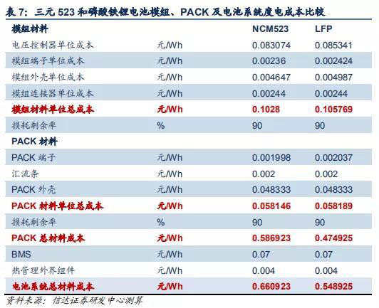 按照工藝順序電芯之后是模組和 PACK,其中模組材料包括電壓控制器、模組端子、模組外殼以及模組連接器,PACK 材料主 要包括 PACK 端子、匯流條和 PACK 外殼。據(jù)我們測(cè)算,三元 523 電池的模組材料和 PACK 材料度電成本分別為 102.8 和 58.15 元/ kWh,磷酸鐵鋰的分別為 105.77 和 58.19 元/ kWh。至此,我們已完成 PACK 總材料成本的測(cè)算,經(jīng)加總后得出三 元 523 和磷酸鐵鋰的 PACK 所有材料的總度電成本分別為 586.92 和 474.93 元/ kWh??紤]電池管理系統(tǒng)和熱管理組件成本 的情況下,我們測(cè)算得出目前三元 523 和磷酸鐵鋰電池系統(tǒng)材料總度電成本分別為 660.92 和 548.93 元/ kWh。