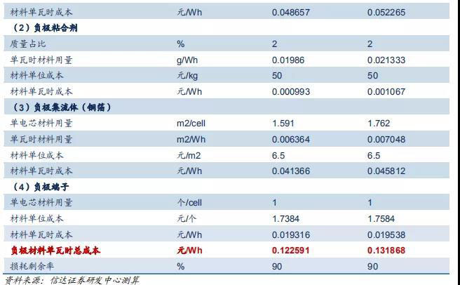 負(fù)極材料包括負(fù)極活性材料、負(fù)極粘合劑、負(fù)極集流體(銅箔)和負(fù)極組件負(fù)極端子。據(jù)我們測(cè)算,目前三元 523 負(fù)極活性 材料、粘合劑、銅箔、負(fù)極端子度電成本分別為 48.66、0.99、41.37、19.32 元/kWh,磷酸鐵鋰電池分別為 52.27、1.07、 45.81、19.54 元/kWh,負(fù)極材料中活性材料、銅箔和負(fù)極端子成本占比較高,粘合劑占比較低??紤]到材料損耗,我們測(cè)算 得出三元 523 負(fù)極材料度電總成本為 122.59 元/ kWh,磷酸鐵鋰負(fù)極材料度電總成本為 131.87 元/ kWh。由于能量密度的不 同以及其他材料接近的原因,磷酸鐵鋰電池的負(fù)極材料成本高于三元電池。