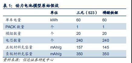 我們假設(shè)單車帶電量 60kWh,包括 1 個(gè)電池包,20 個(gè)模組和 240 個(gè)電芯,以上假設(shè)主要用于測(cè)算模組和 PACK 組件成本。 我們選取三元?jiǎng)恿︿囯姵?523 型和磷酸鐵鋰電池作為研究對(duì)象進(jìn)行分析比較。參考當(dāng)升科技公告數(shù)據(jù),我們假設(shè)三元(523) 正極材料實(shí)際克容量為 157mAh/g。參考國(guó)軒高科和豐元股份公告數(shù)據(jù),目前國(guó)內(nèi)磷酸鐵鋰正極材料實(shí)際克容量基本已經(jīng)達(dá)到 150mAh/g,我們?nèi)?145mAh/g 的平均水平作為磷酸鐵鋰正極材料實(shí)際克容量假設(shè)。參考杉杉股份公告數(shù)據(jù),我們假設(shè)負(fù)極活 性材料(人造石墨)實(shí)際克容量為 350 mAh/g。