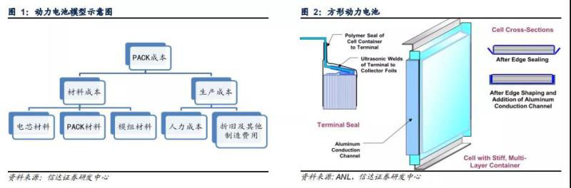 鋰電池根據(jù)應(yīng)用領(lǐng)域的不同分為動(dòng)力電池、儲(chǔ)能電池和消費(fèi)電子電池,不同類型鋰電池的成本構(gòu)成自然不同,本篇報(bào)告主要 講述應(yīng)用最廣泛的動(dòng)力電池成本結(jié)構(gòu)。動(dòng)力電池在不同的正負(fù)極材料下其成本有一定差別,整體來(lái)看材料成本占比較大,人 工成本、折舊及其他制造費(fèi)用占比較小,而材料成本則主要以正負(fù)極材料、隔膜、電解液和組件為主。 我們?cè)趧?dòng)力電池成本模型里將 PACK 成本拆分成材料成本和生產(chǎn)成本,其中材料成本又包括電芯材料、模組材料及 PACK 材 料,生產(chǎn)成本包括人力成本、折舊及其他制造費(fèi)用。我們參考 ANL 的成本測(cè)算模型,選取方形電池進(jìn)行成本拆分。