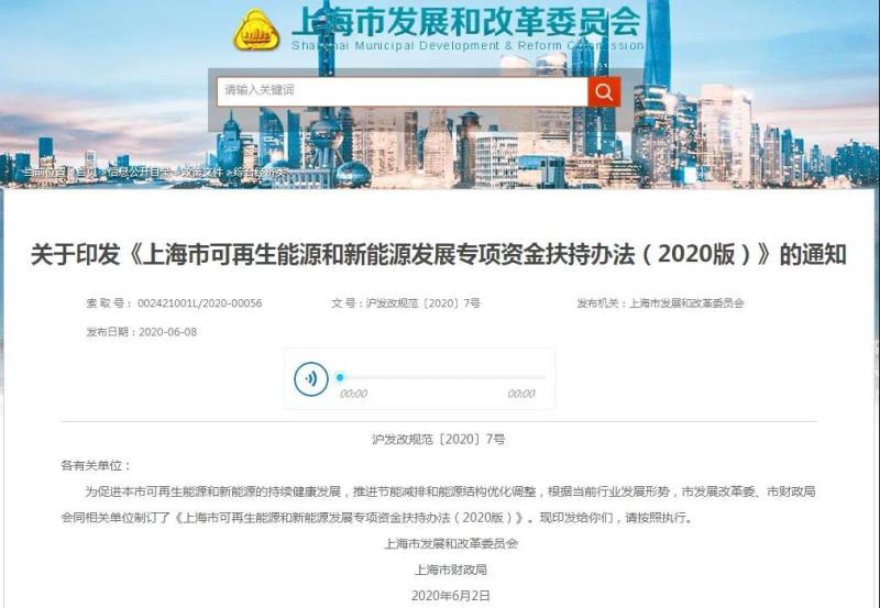6月8日,上海市發(fā)展改革委、市財政局研究制訂的《上海市可再生能源和新能源發(fā)展專項資金扶持辦法(2020版)》(下簡稱《辦法》)對外發(fā)布,將對于企業(yè)投資的風電、光伏項目,根據(jù)實際產(chǎn)生的電量對項目投資主體給予獎勵,獎勵時間為連續(xù)5年,單個項目年度獎勵金額不超過5000萬元。