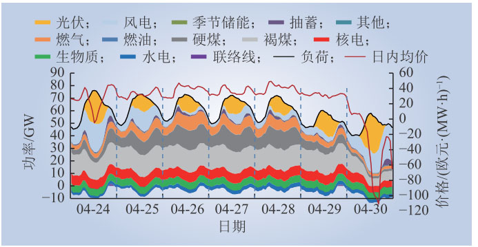 從實際運行來看,新能源按照0電價參與電力市場競價(實際結(jié)算電價還包括政府補貼),以保障優(yōu)先上網(wǎng)。當(dāng)新能源出力高時,電力市場的出清電價下降,甚至出現(xiàn)負(fù)電價,受電價影響,火電、燃油燃?xì)獍l(fā)電等盡可能降低出力,國外電力市場同樣從德國買入電力;當(dāng)新能源出力低時,電力市場出清價大幅上漲,刺激各類靈活電源包括國外電源提高發(fā)出電力。