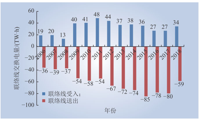 從聯(lián)絡(luò)線送受電量來看,由于德國新能源裝機容量較大,風(fēng)、光出力波動明顯,除了依靠本國硬煤發(fā)電、燃?xì)獍l(fā)電調(diào)節(jié)外,還依靠跨國聯(lián)絡(luò)線開展電力平衡,利用他國資源平衡本國風(fēng)光波動。當(dāng)本國來風(fēng)、來光較小時,本國電源不能及時開機以保證供電,市場出清價格較高,從國外購入電力;當(dāng)本國風(fēng)電、太陽能發(fā)電出力較大時,市場出清價格較低甚至是負(fù)電價,向國外低價售出電力。德國跨國聯(lián)絡(luò)線交換電量逐年增加,從2006年的55TW·h上升到2017年的107TW·h,增長將近一倍,2018年有所下降,至93TW·h,如圖4所示。