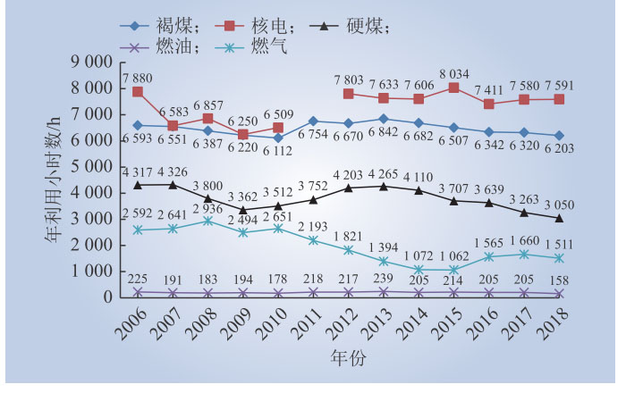 從新能源發(fā)展對常規(guī)電源影響來看,2006—2018年德國燃油發(fā)電主要用途為電網(wǎng)高峰負(fù)荷備用、應(yīng)急備用或距離電網(wǎng)較遠(yuǎn)地區(qū)的供電,年平均小時數(shù)比較固定,僅203h。燃?xì)獍l(fā)電雖然裝機容量逐漸增加,但由于需要配合風(fēng)電和光伏發(fā)電開展每日的電力平衡,發(fā)電小時數(shù)逐漸下降,年平均1969h。核電、褐煤發(fā)電也基本不參與電力平衡調(diào)節(jié),僅在市場價格長時間為負(fù)電價時采取降出力或關(guān)機調(diào)節(jié),核電2006—2018年平均小時數(shù)為7311h(2011年因裝機容量變化較大,未計入),褐煤發(fā)電年平均小時數(shù)為6475h。配合風(fēng)、光波動開展調(diào)節(jié)的主要是硬煤發(fā)電,導(dǎo)致硬煤發(fā)電小時數(shù)逐漸下降,從2006年的4317h降低到2018年的3050h。