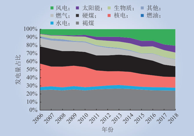 從各類電源年發(fā)電量變化看,褐煤、水電、燃油機組發(fā)電量未有明顯變化;核電受裝機容量減小影響,發(fā)電量減??;風(fēng)電、太陽能發(fā)電、生物質(zhì)發(fā)電受裝機容量增大影響,發(fā)電量迅速增長;硬煤發(fā)電量逐年減小,但幅度下降不大;燃?xì)獍l(fā)電雖然裝機容量增長較快,但發(fā)電量有所降低。各類電源年發(fā)電量占比的變化情況如圖2所示,可以看出,風(fēng)電、太陽能發(fā)電、生物質(zhì)發(fā)電發(fā)電量占比不斷增加,替代了部分核電、硬煤發(fā)電和燃?xì)獍l(fā)電電量。