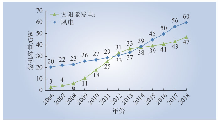 圖1 德國國風(fēng)電、太陽能發(fā)電裝機容量變化