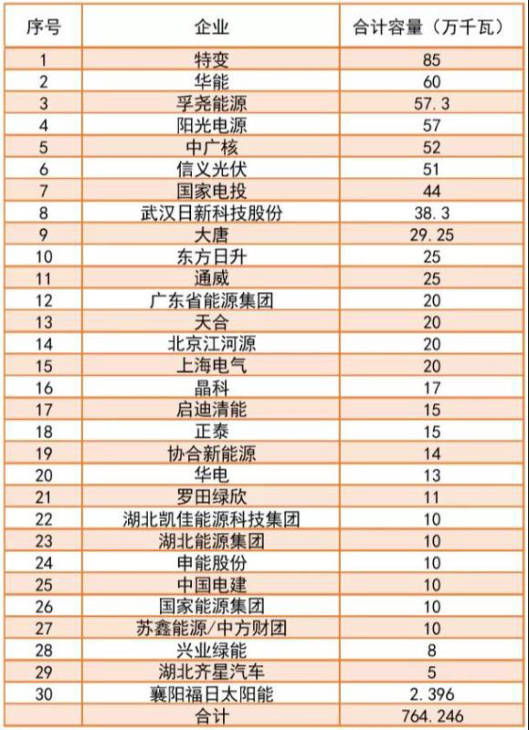 根據(jù)文件,此次符合競(jìng)爭(zhēng)配置條件的平價(jià)光伏發(fā)電項(xiàng)目名單中,共有30家企業(yè)的76個(gè)項(xiàng)目7.64GW入圍,其中特變的規(guī)模最大,為850MW;華能次之,為600MW;陽光電源以570MW的規(guī)模,次于孚堯能源573MW,位居第四;中廣核以520MW的規(guī)模位居第五;另外信義光伏、國(guó)家電投等企業(yè)也都入圍了不錯(cuò)的規(guī)模。
